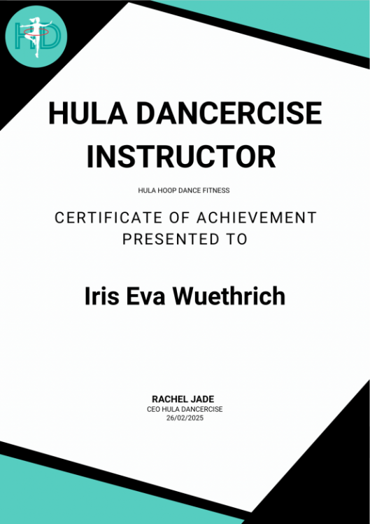 2021 musste ich in England in Quarantäne. Man durfte in dieser Zeit nicht von Haus und so entschied ich mich, einen Hoop mitzunehmen, welchen ich täglich brauchte. Wieder Zuhause in der Schweiz war der Reifen nur noch ab und an in Gebrauch. Erst 2024 fing ich wieder vermehrt an ihn zu brauchen. Da ich mehr darüber lernen wollte, entschied ich mich den Lehrgang zum HulaDancerciseInstructor zu machen. Die Zertifizierung fiel mir sehr leicht, denn Lehrpläne zu schreiben, Leute zu unterrichten, sie auf ihrem Weg zu begleiten und sie in ihrer Entwicklung scheinen zu lassen gehört zu meiner Berufung, die ich in meiner Selbständigkeit täglich ausübe. Auch kenne ich das Tänzerische von meiner Zeit im JazzDance. Neu war für mich die Technik mit dem Hoop.